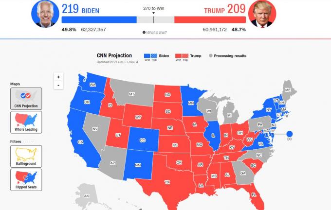 4일 오후 3시 30분(한국시간) 현재 미국 대선 판도. 선거인단 270명을 확보하면 당선이 확정되는데 이 시간 현재 트럼프 후보가 바이든 후보를 맹추격하고 있다. 이 시점에 바이든이 219명, 트럼프가 209명의 대의원을 확보했다.