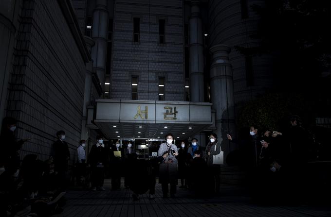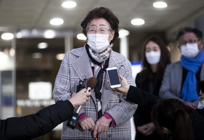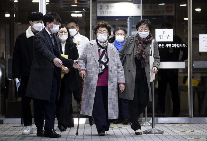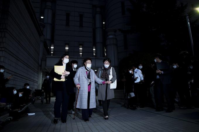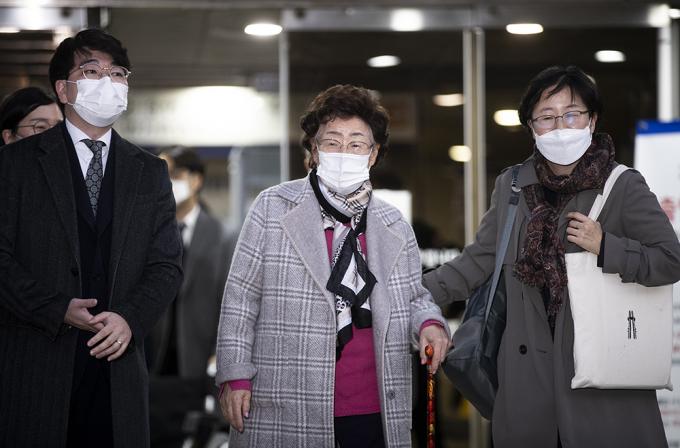일본군 위안부 피해자 이용수 할머니가 11일 오후 서울 서초구 서울중앙지방법원에서 열린 일본 정부 상대 손해배상 청구 소송 변론기일에 증인으로 출석해 증언을 마친 뒤 법원을 나서고 있다.