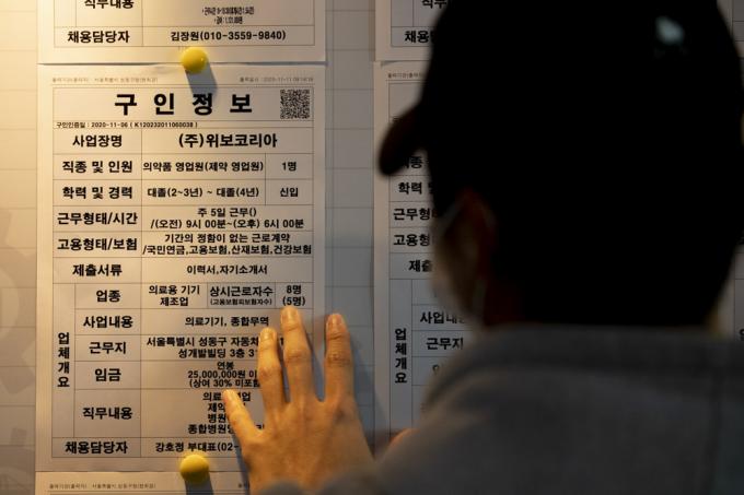 코로나19 사태 영향으로 고용한파가 이어지고 있는 가운데 10월 취업자 수가 6개월 만의 최대 감소를 기록했다. 통계청이 지난 11일 발표한 '10월 고용동향'에 따르면 지난달 취업자 수는 2708만8000명으로, 작년보다 42만1000명 감소했다. 사진은 12일 오후 서울 성동구청 희망일자리센터 모습.