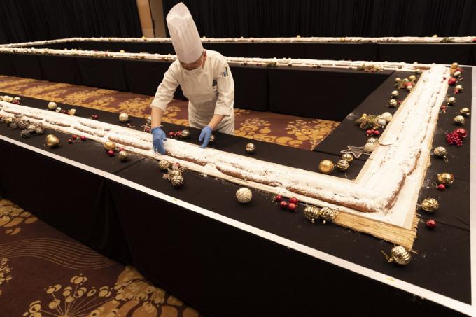 '밀레니엄 힐튼 서울, 크리스마스 기차' 25주년 기념 행사가 16일 서울 중구 밀레니엄 힐튼 서울에서 열린 가운데 호텔 주방 관계자가 세계기록에 도전하는 '슈톨렌' 독일빵을 살펴보고 있다.