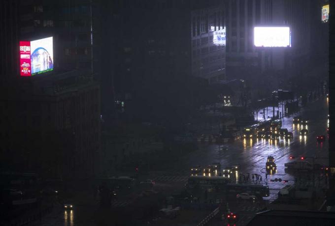 출근길 많은 비가 내리고 있는 19일 오전 서울 종로구 광화문 일대에서 차량들이 빗길을 달리고 있다. 전국 대부분 지역에 천둥, 번개를 동반한 비가 내리며 서해안과 강원영동, 경상해안, 남해안, 제주산지 등에 강풍특보를 발효 중인 가운데 기상청은 시설물 관리와 안전사고에 주의할 것을 당부했다.