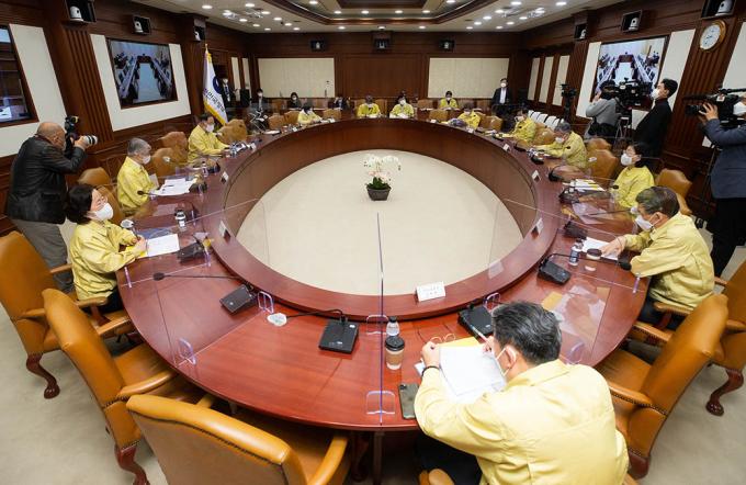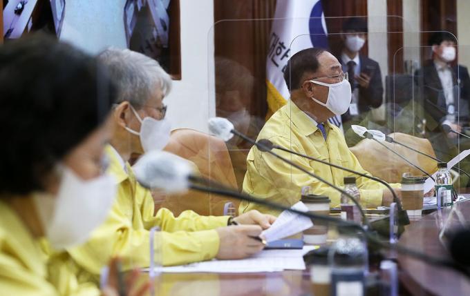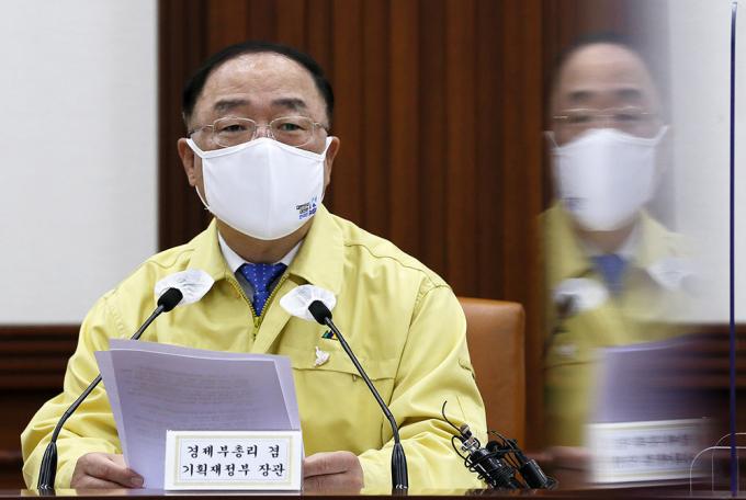 홍남기 경제부총리 겸 기획재정부 장관이 19일 오전 정부서울청사에서 열린 제5차 한국판 뉴딜 관계장관회의 겸 제20차 비상경제중앙대책본부회의에 참석해 발언하고 있다.