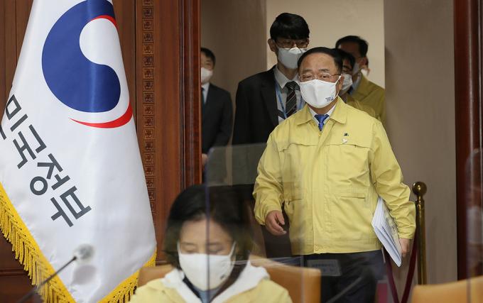 홍남기 경제부총리 겸 기획재정부 장관이 19일 오전 정부서울청사에서 열린 제5차 한국판 뉴딜 관계장관회의 겸 제20차 비상경제중앙대책본부회의에 참석하고 있다.