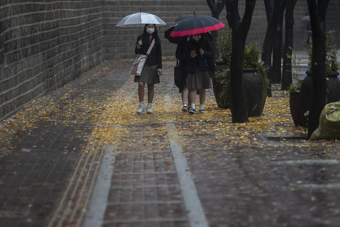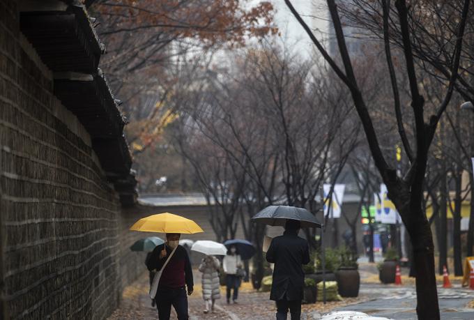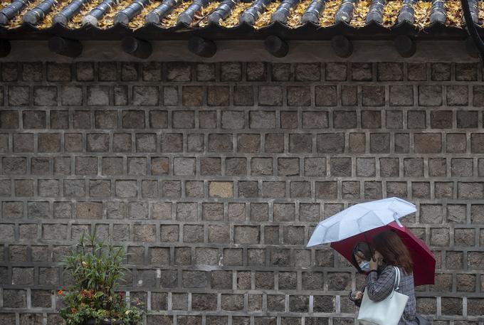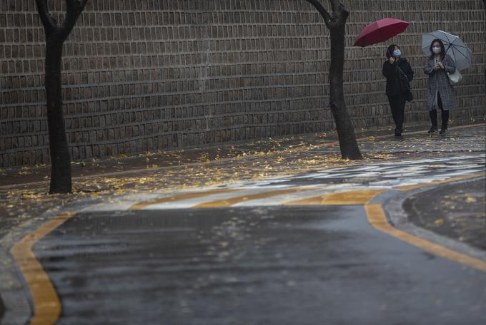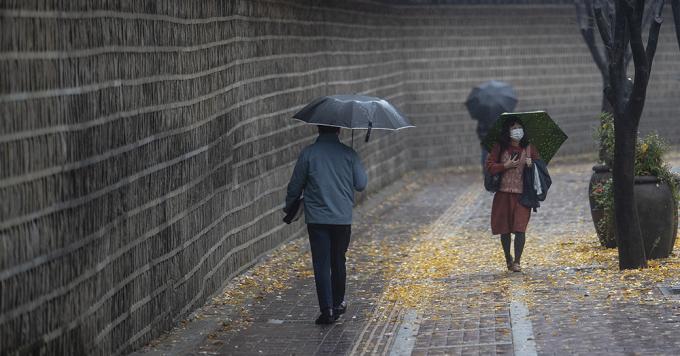 전국적으로 많은 비가 내리고 있는 19일 오후 서울 중구 덕수궁 돌담길에서 우산을 쓴 시민들이 발걸음을 옮기고 있다.