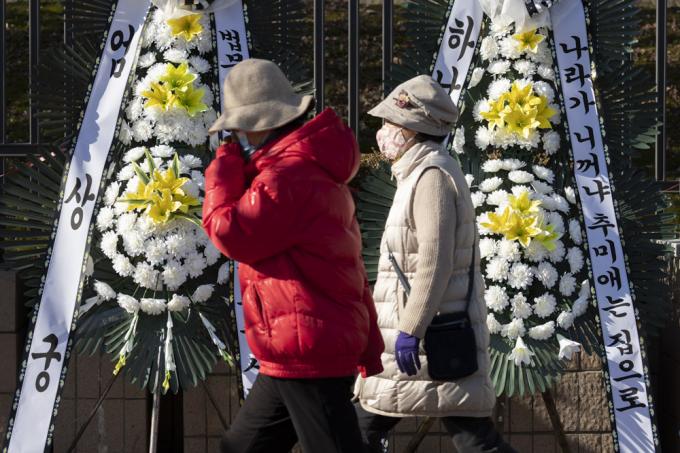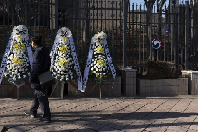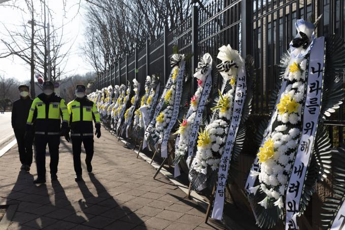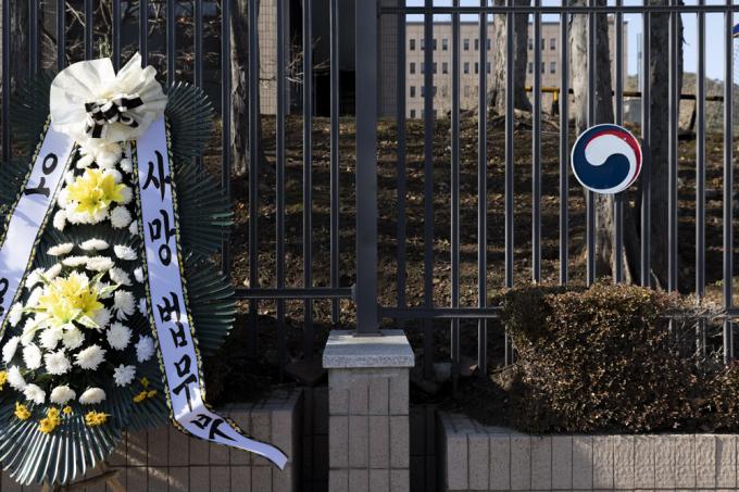 23일 오후 경기 정부과천청사 앞에 추미애 법무부 장관을 비판하는 근조화환이 놓여 있다.