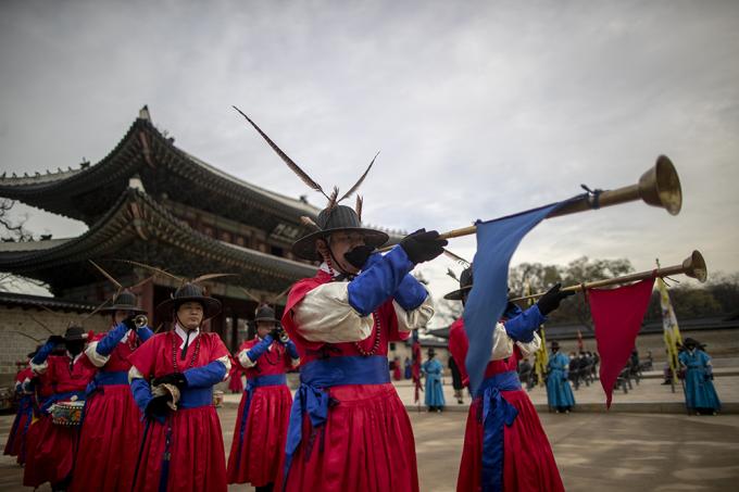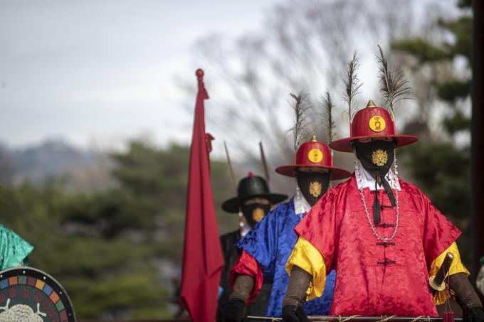 24일 오전 서울 종로구 창덕궁 돈화문광장에서 열린 관람지원센터 개소식과 돈화문 월대 개선공사 준공식에서 수문장 교대식이 열리고 있다.
