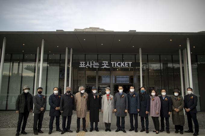 24일 오전 서울 종로구 창덕궁 돈화문광장에서 열린 관람지원센터 개소식과 돈화문 월대 개선공사 준공식에서 정재숙 문화재청장 등 참석자들이 기념사진을 찍고 있다.