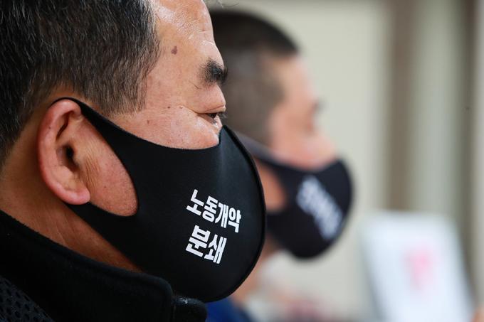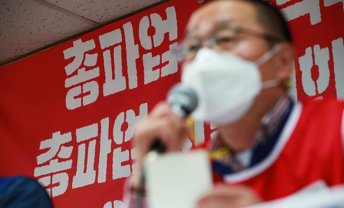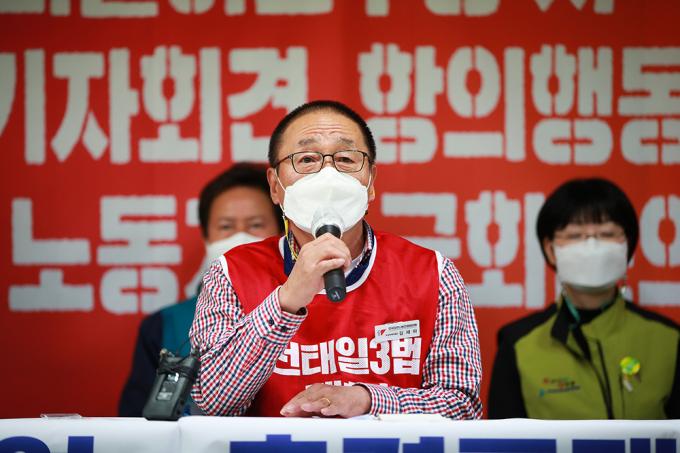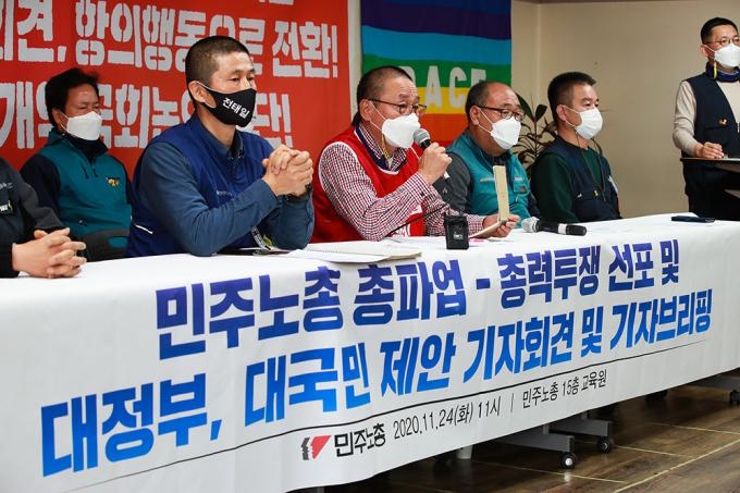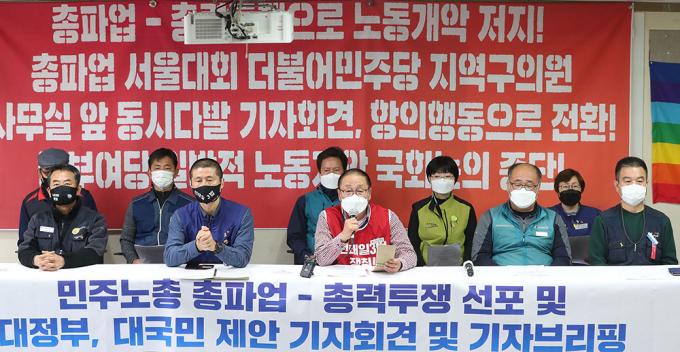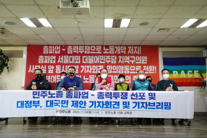 '민주노총 총파업-총력투쟁 선포 및 대정부, 대국민 제안 기자회견'이 서울 중구 정동 민주노총 사무실에서 열리고 있다. 민주노총은 총파업 당일인 25일 전국 곳곳에서 노조 간부와 파업 참가자를 중심으로 집회를 열 계획이라고 밝혔다. 서울 집회는 당초 여의도 국회 앞에서 개최할 계획이었지만, 10인 이상 집회를 전면 금지한 서울시 방역 수칙에 따라 시내 곳곳의 더불어민주당 지역구 사무실 앞에서 10인 미만 규모의 집회를 산발적으로 열기로 했다.