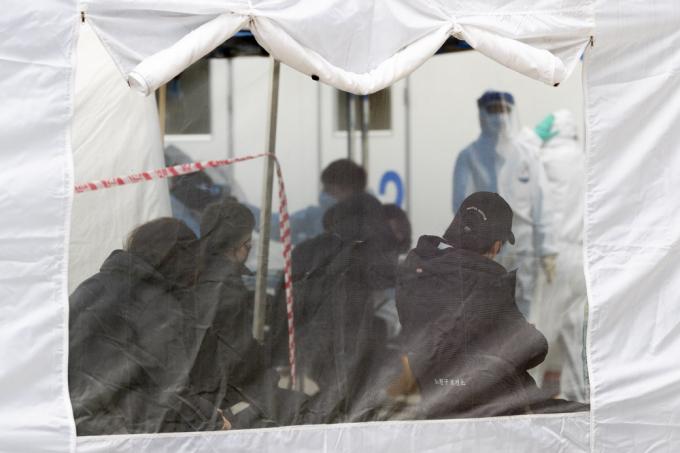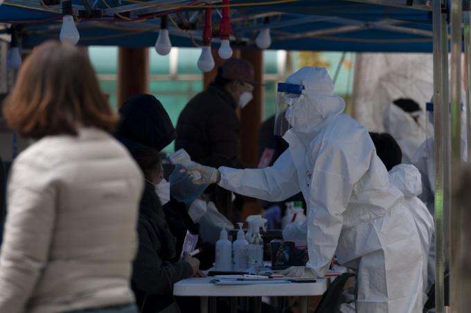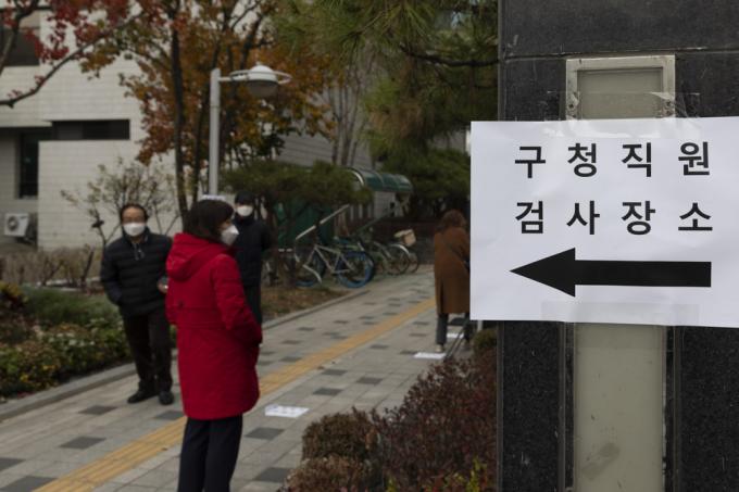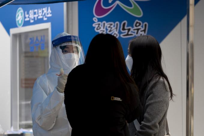서울 노원구청에서 코로나19 확진자가 발생해 청사 전체를 폐쇄한 24일 오후 해당 구청 인근 선별진료소에서 의료진이 분주히 움직이고 있다.