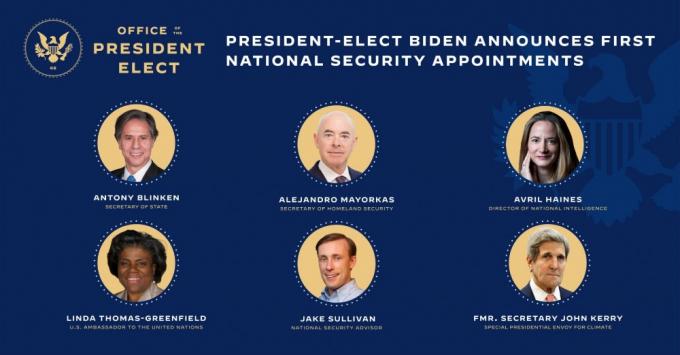바이든 당선인 인수위원회는 23일(현지시간) 새 행정부의 국무장관, 백악관 국가안보보좌관, 기후변화 대통령 특사, 국토안보부 장관, 국가정보국(DNI) 국장, 유엔 주재 미국 대사를 발표했다.