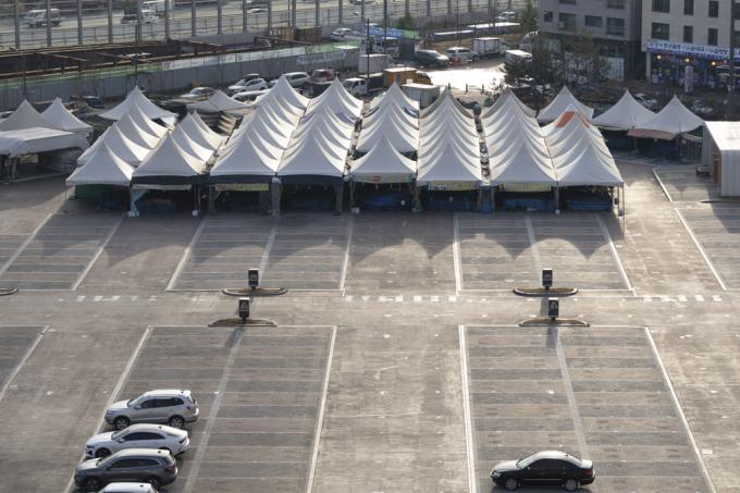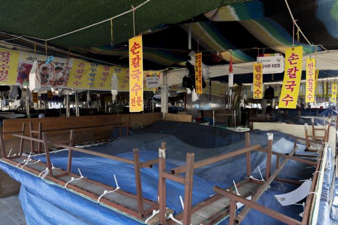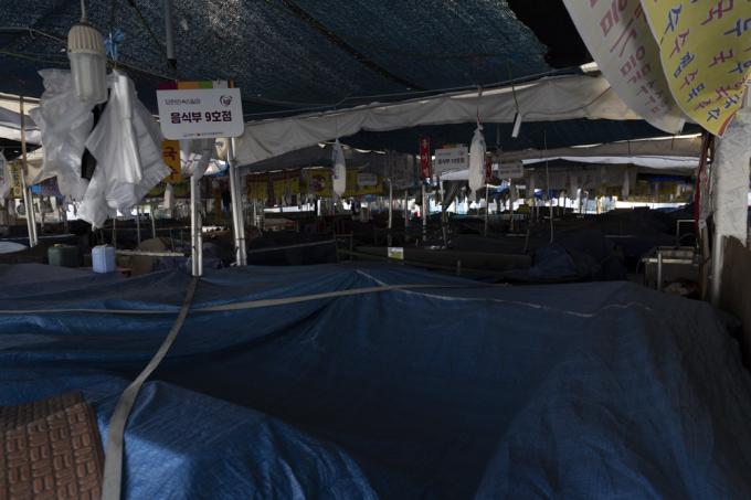 수도권 사회적 거리두기 2단계가 시행되고 있는 24일 오후 경기 성남 모란시장 오일장터가 텅 비어 있다. 전국 최대 민속 오일장인 모란오일장은 거리두기 단계 상향 조정으로 24일과 오는 29일, 12월 4일까지 휴장한다.
