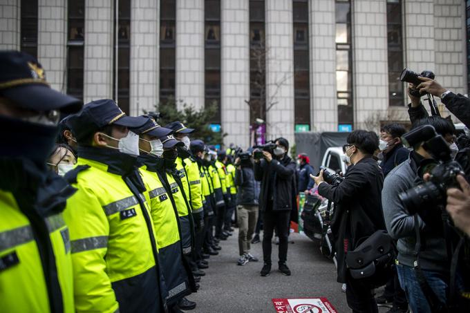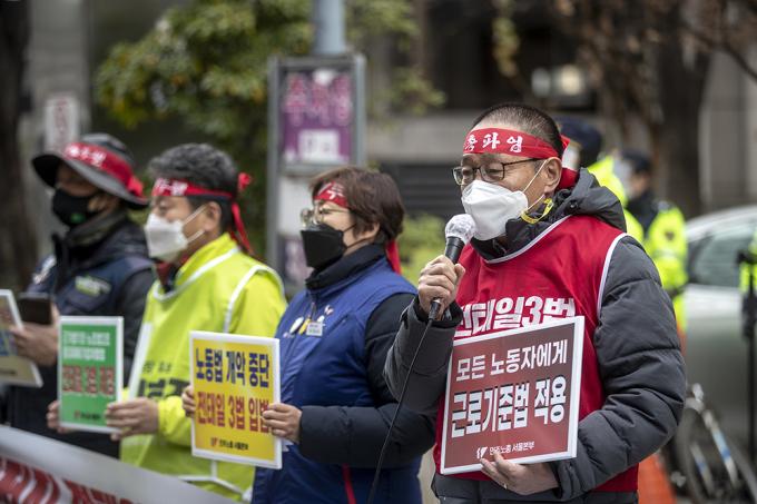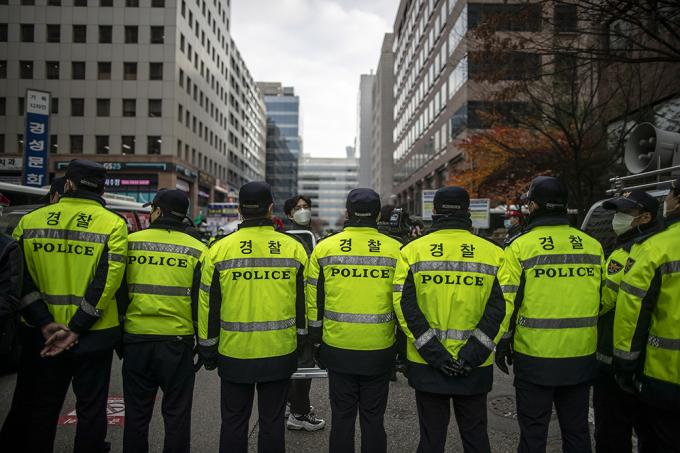 25일 오후 서울 영등포구 더불어민주당 서울시당 앞에서 열린 노동개악 저지, 전태일3법 쟁취, 민주노총 전국 동시다발 총파업 기자회견이 열리기 전 경찰이 집회인원을 통제하기 위해 근무를 서고 있다.