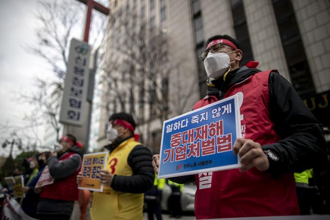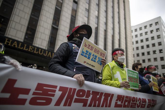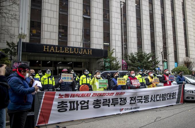 25일 오후 서울 영등포구 더불어민주당 서울시당 앞에서 열린 노동개악 저지, 전태일3법 쟁취, 민주노총 전국 동시다발 총파업 기자회견이 코로나19 확산 방지를 위해 10명 미만 기자회견 형식으로 열리고 있다.