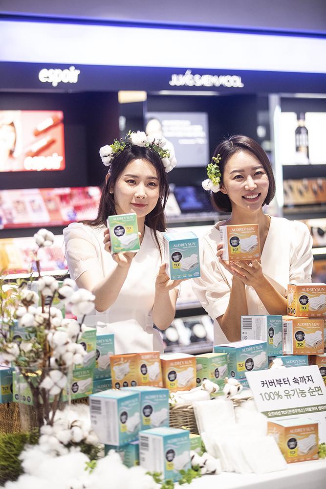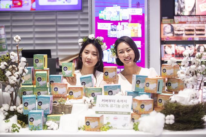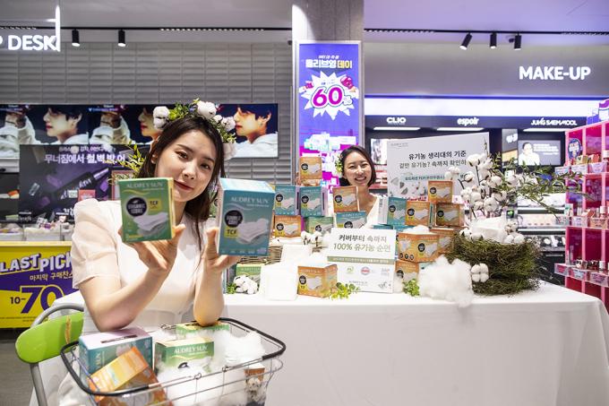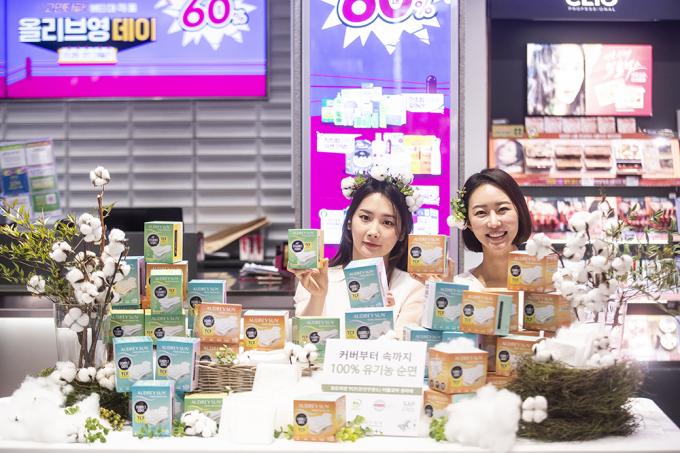 TCF 유기농 생리대 '오드리선'이 26일 오전 서울 중구 올리브영명동 플래그십에서 올영세일 생리대 대전 참여를 홍보하고 있다. 국내 유일 완전무염소 TCF 유기농 생리대 오드리선은 오는 11월 30일부터 12월 6일까지 열리는 올리브영 올영세일 생리대 대전에 유기농 대표 브랜드로 참여해, 최대 37% 할인된 가격으로 만나볼 수 있다.