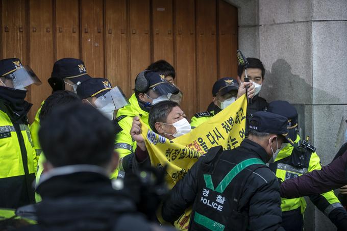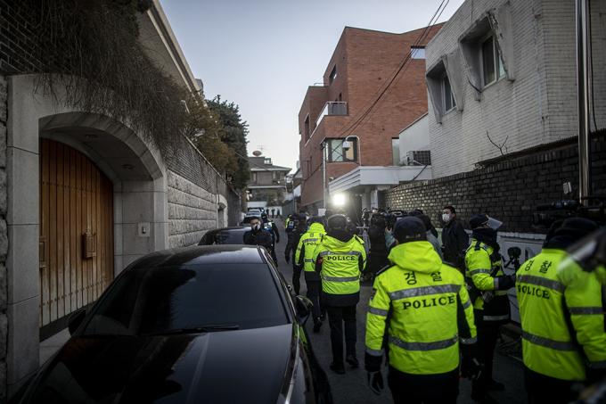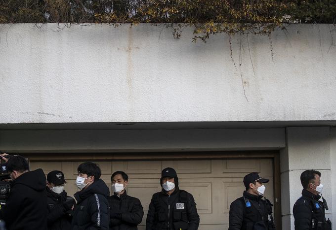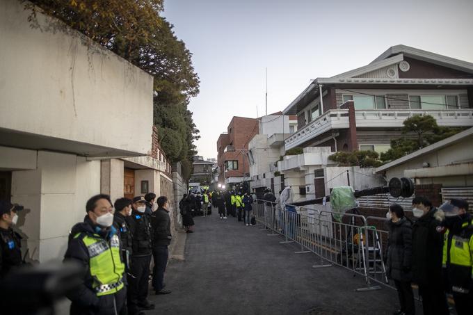 광주지방법원에서 열리는 1심 선고 공판에 전직 대통령 전두환 씨의 출석이 예정된 30일 오전 서울 서대문구 연희동 전 씨 자택 앞에 취재진과 경찰, 경호인력 등이 모여있다. 전 씨는 5.18 당시 헬기사격을 증언한 고(故) 조비오 신부에 대한 사자명예훼손 혐의로 기소됐다.