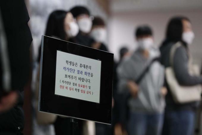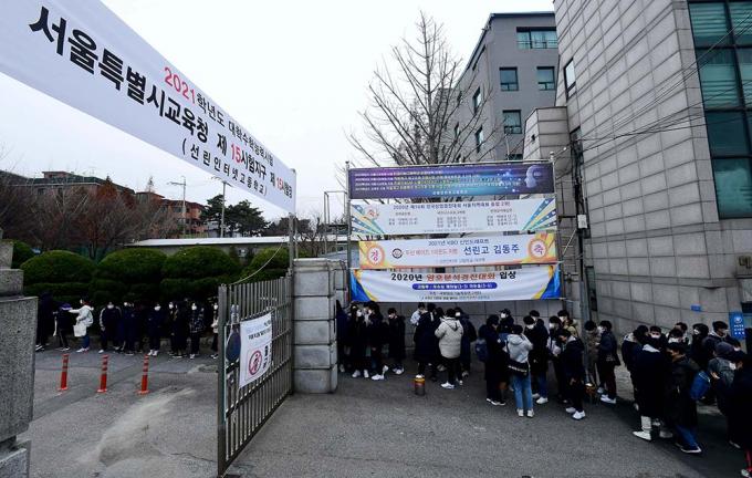 2021학년도 대학수학능력시험 예비소집일인 2일 서울 용산구 선린인터넷고등학교에서 수험생들이 수험표를 받기 위해 기다리고 있다.