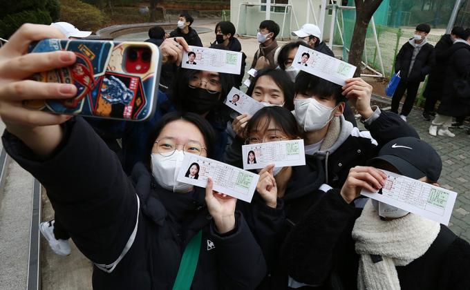 2021학년도 대학수학능력시험 예비소집일인 2일 서울 용산구 선린인터넷고에서 학생들이 수험표를 들고 기념촬영을 하고 있다.