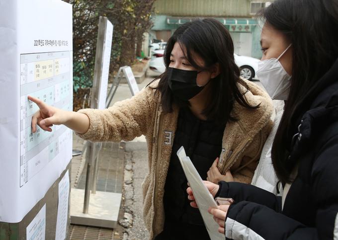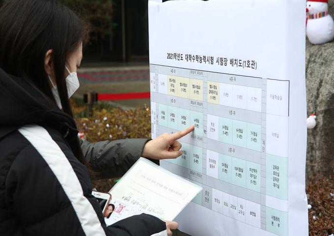 2021학년도 대학수학능력시험 예비소집일인 2일 서울 용산구 선린인터넷고에서 학생들이 시험장을 위치를 확인하고 있다.