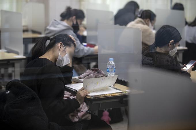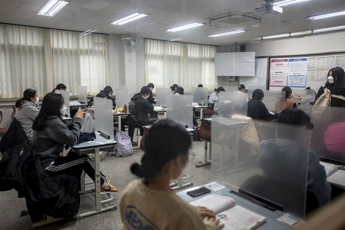 2021학년도 대학수학능력시험일인 3일 오전 서울 서초구 반포고등학교에서 수험생들이 시험 시작 전 마지막 공부를 하고 있다.