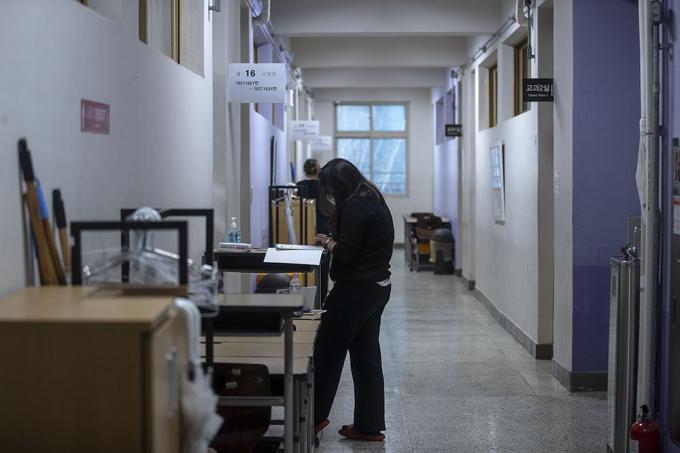 2021학년도 대학수학능력시험일인 3일 오전 서울 서초구 반포고등학교에서 한 수험생이 시험 시작 전 마지막 공부를 하고 있다.