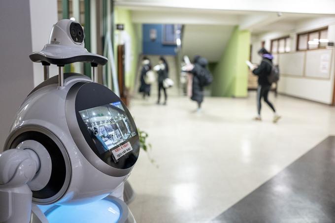 2021학년도 대학수학능력시험일인 3일 오전 서울 서초구 반포고등학교에 마련된 시험장에 인공지능(AI) 열화상 카메라 로봇이 체온을 측정하고 있다.