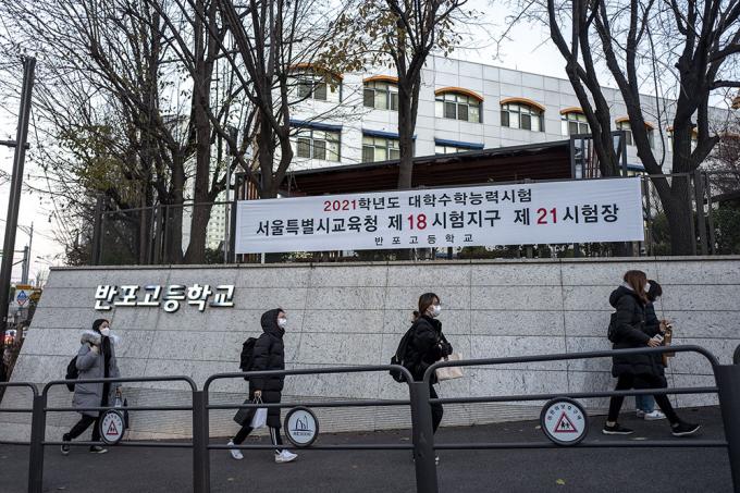 2021학년도 대학수학능력시험일인 3일 오전 서울 서초구 반포고등학교에서 수험생들이 거리두기를 하며 시험장으로 들어가고 있다.