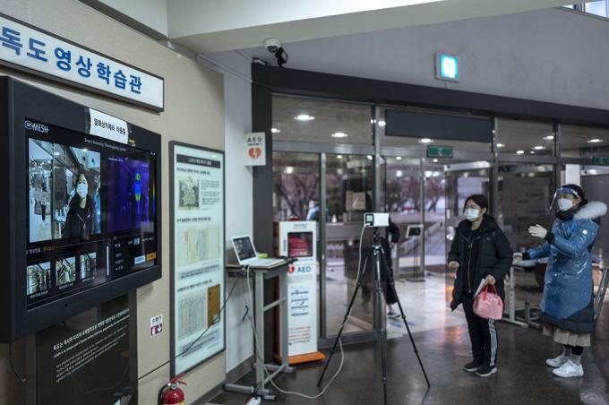2021학년도 대학수학능력시험일인 3일 오전 서울 서초구 반포고등학교에 마련된 시험장에서 수험생들이 열화상 카메라로 체온을 측정하고 있다.