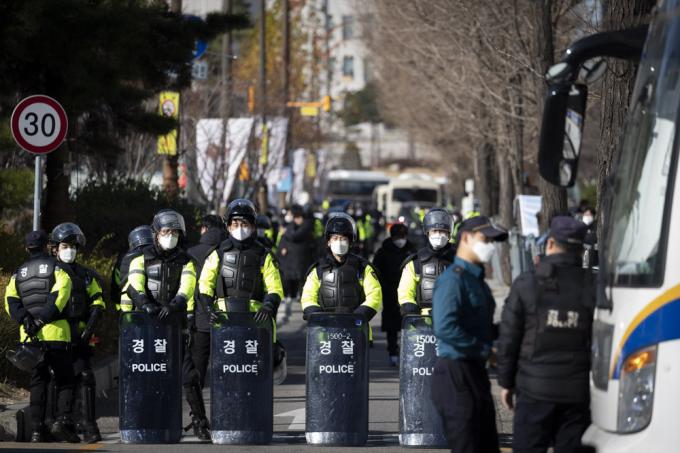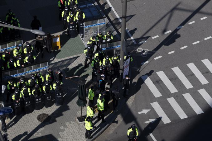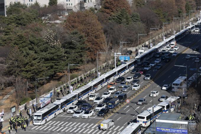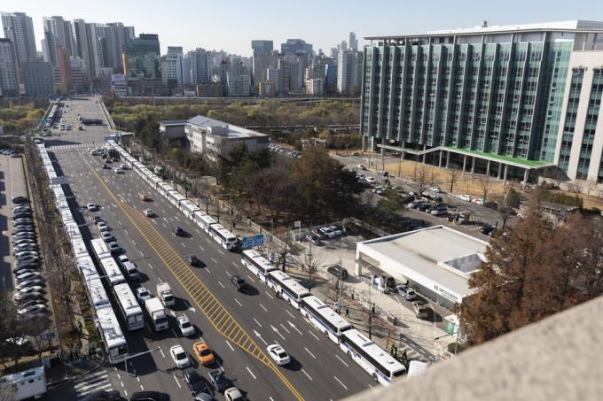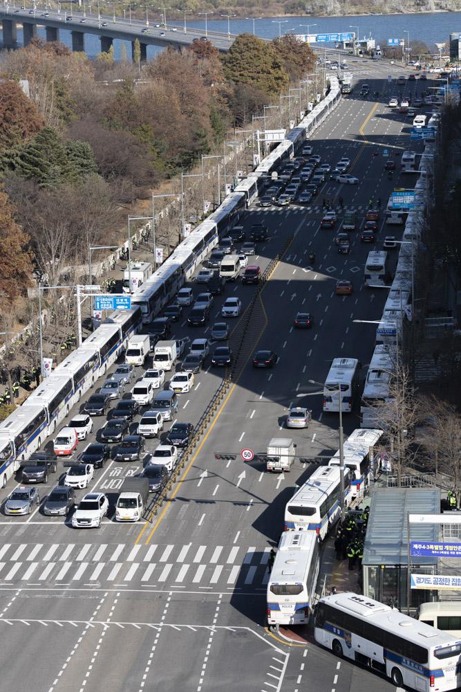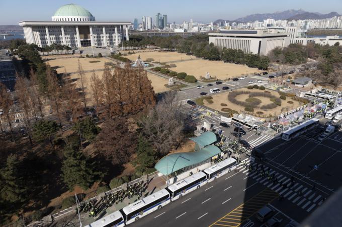 4일 서울 여의도 국회 인근 도로에 민주노총 및 산별노조의 집회에 대비해 경찰 차벽이 설치돼 있다.
