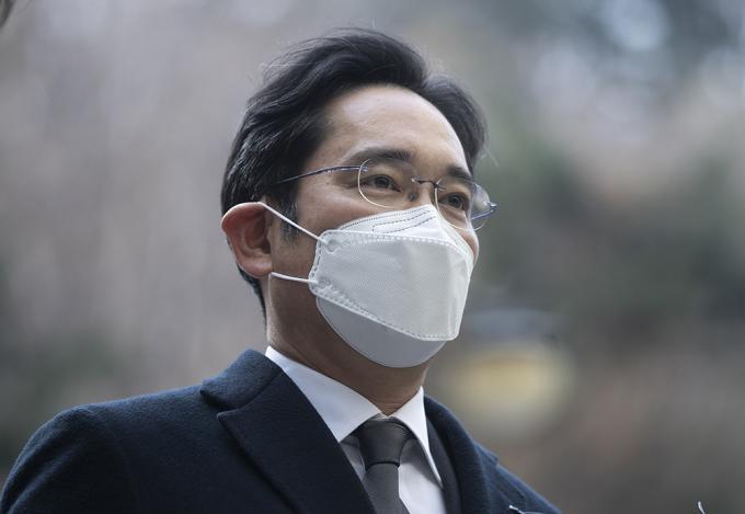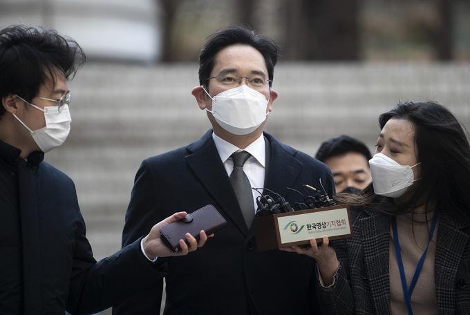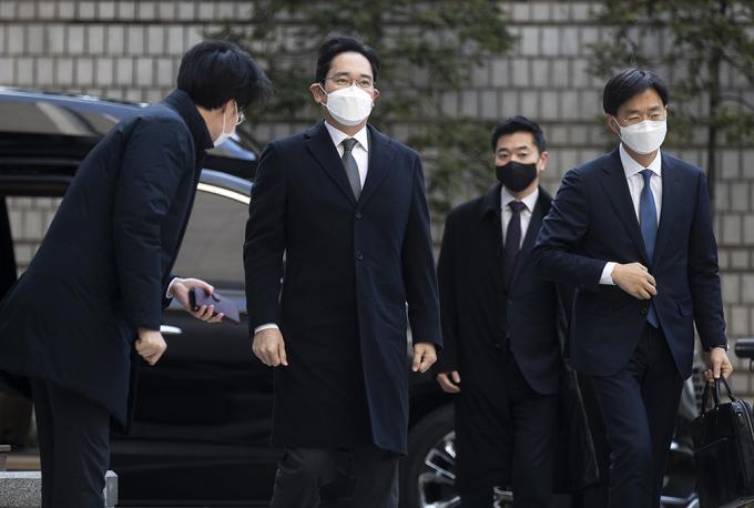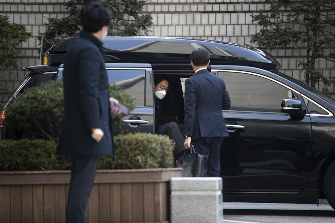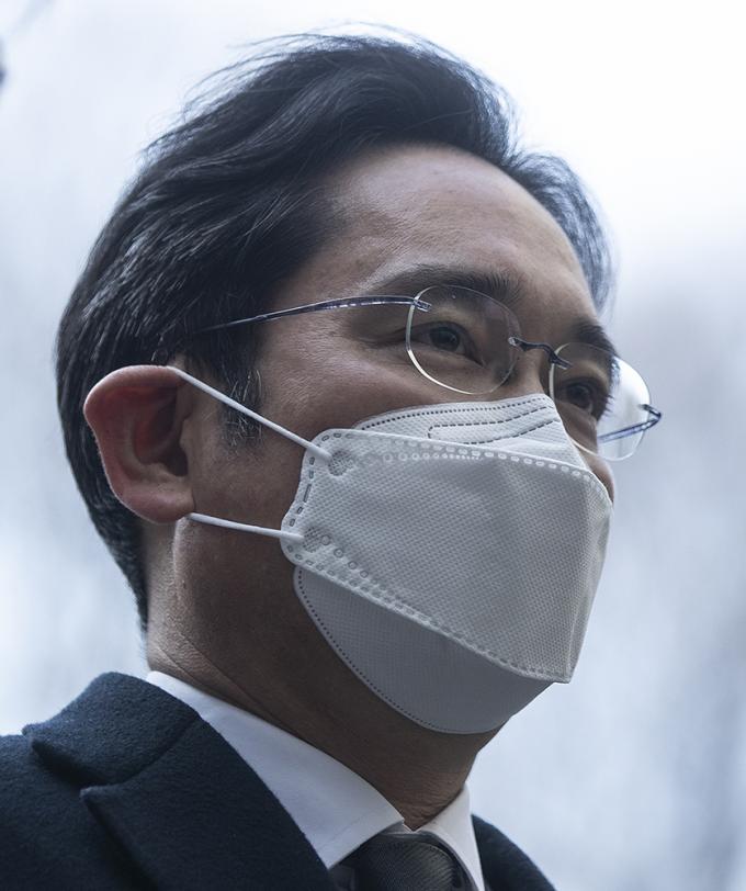 이재용 삼성전자 부회장이 7일 오후 서울 서초구 서울고등법원에서 열린 국정농단 파기환송심 속행 공판에 출석하고 있다.