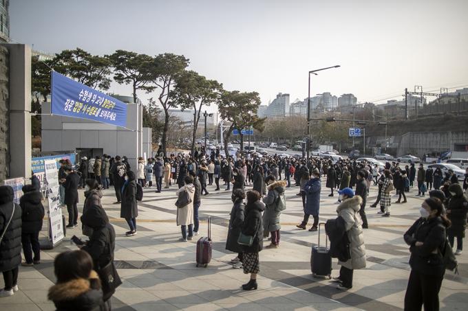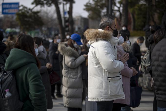 7일 오후 수시모집 논술전형 시험이 열린 서울 서대문구 연세대학교 교문에서 수험생 학부모들이 자녀들을 기다리며 기도하고 있다.