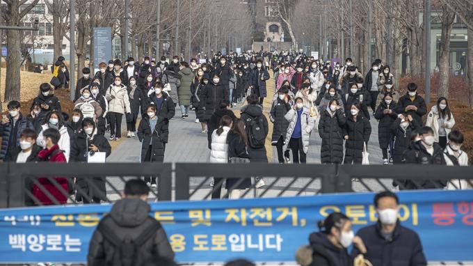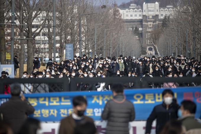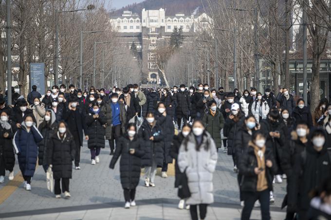 7일 오후 서울 서대문구 연세대학교에서 열린 2021학년도 수시모집 논술전형 시험(인문·사회계열)을 마친 수험생들이 시험장을 나서고 있다.