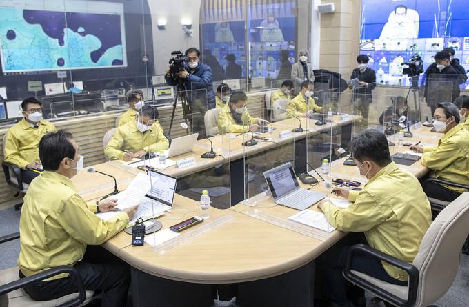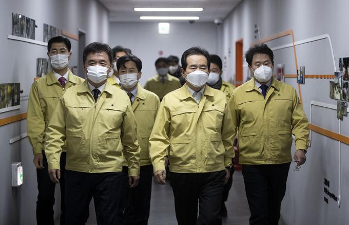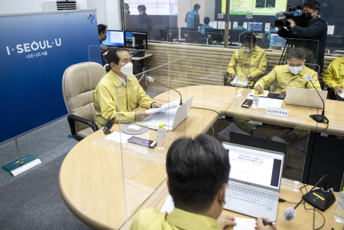 정세균 국무총리(가운데)와 서정협(왼쪽) 서울시장 권한대행이 14일 오전 서울 중구 서울시청에서 열린 코로나19 대응 중앙재난안전대책본부 겸 수도권 상황점검회의에 참석하고 있다.