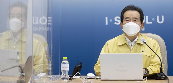 정세균 국무총리가 14일 오전 서울 중구 서울시청에서 열린 코로나19 대응 중앙재난안전대책본부 겸 수도권 상황점검회의에서 모두발언하고 있다.