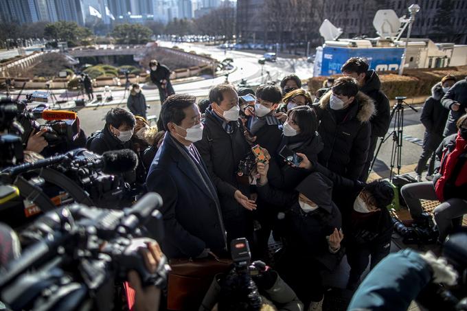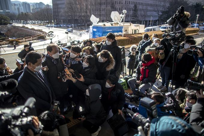 윤석열 검찰총장에 대한 2차 검사 징계위원회가 열리는 15일 오전 윤석열 검찰총장 측 변호인인 이완규 변호사가 경기도 과천 정부과천청사 법무부로 들어가며 취재진의 질문에 답하고 있다.