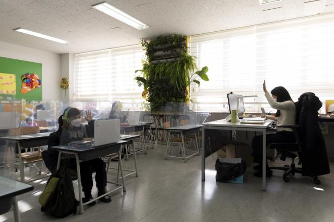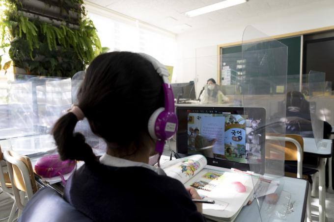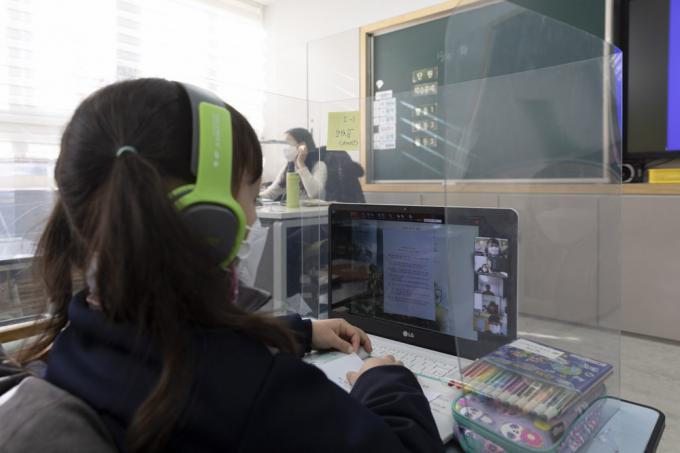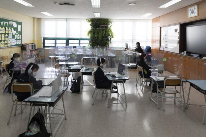 코로나19 3차 대유행이 지속됨에 따라 서울, 인천, 경기 초등학교와 유치원이 사회적 거리두기 3단계에 준하는 원격수업으로 전환된 15일 서울 노원구 화랑초등학교에서 긴급돌봄 어린이들이 원격수업을 듣고 있다.