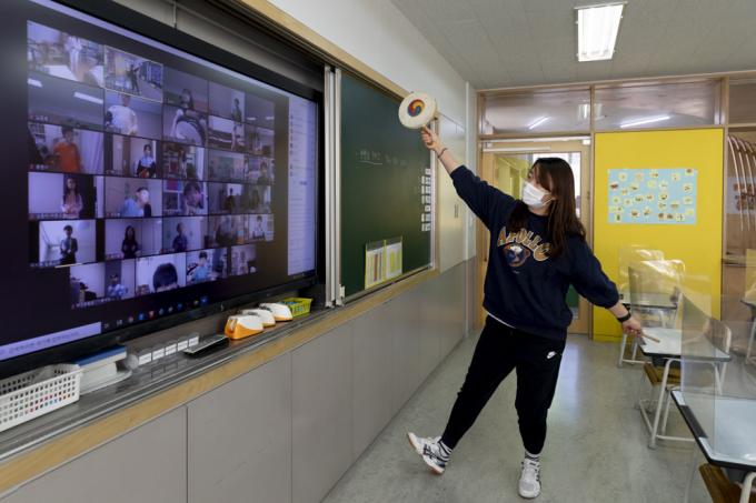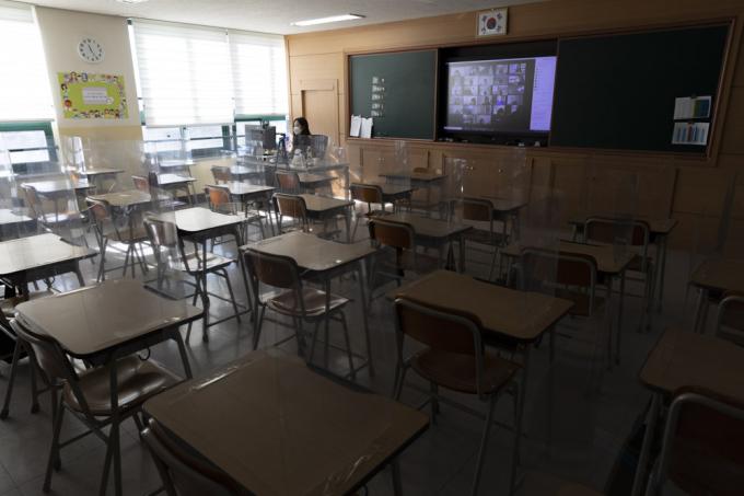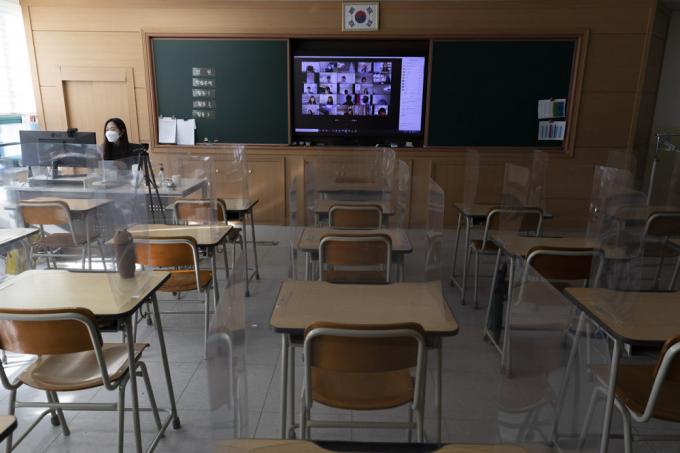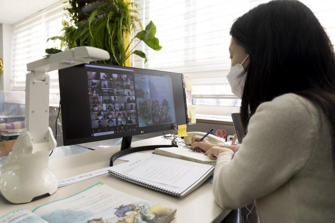 코로나19 3차 대유행이 지속됨에 따라 서울, 인천, 경기 초등학교와 유치원이 사회적 거리두기 3단계에 준하는 원격수업으로 전환된 15일 서울 노원구 화랑초등학교에서 선생님이 화상 원격수업을 진행하고 있다.