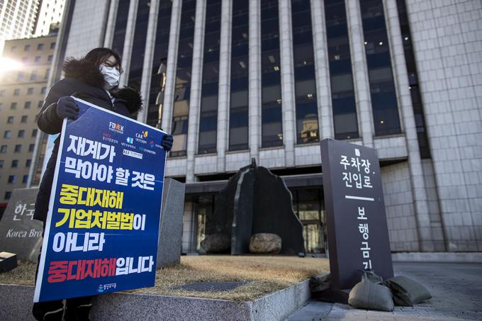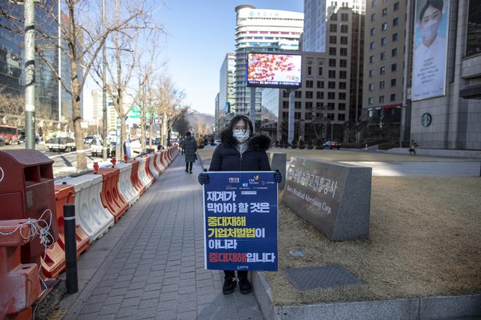 청년유니온 관계자가 16일 오전 서울 중구 한국프레스센터 앞에서 30여 개 경제단체에 대한 중대재해기업처벌법 촉구 1인시위를 하고 있다.