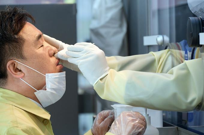 17일 서울 중구 서울광장에 마련된 임시선별진료소에서 의료진이 채취한 서정협 서울시장 권한대행 검체로 코로나19 신속 항원검사를 하고 있다.