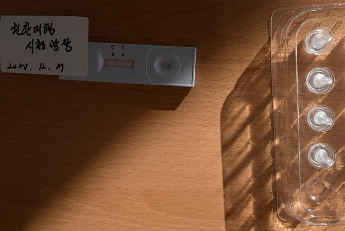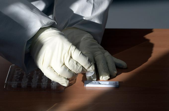 17일 서울 중구 서울광장에 마련된 임시선별진료소에서 의료진이 채취한 서정협 서울시장 권한대행 검체로 코로나19 신속항원검사를 하고 있다. 결과창 C선에만 줄이 나타나면 음성, C선과 T선에 모두 줄이 뜨면 양성이다.