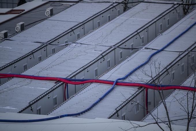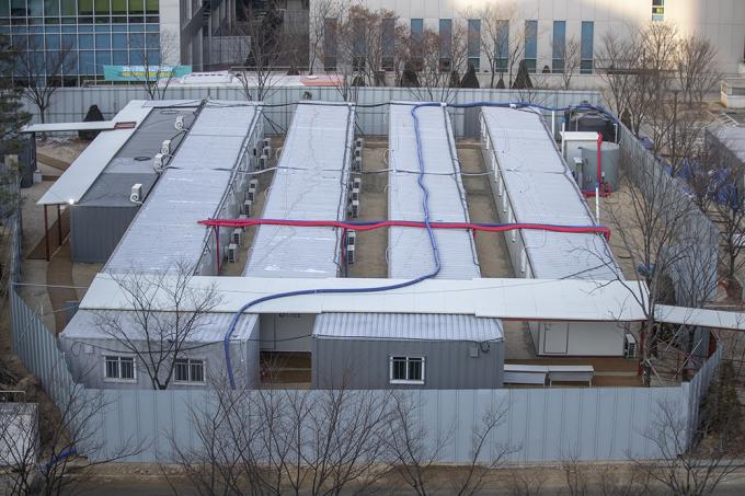코로나19 확진자가 926명으로 엿새 만에 1000명 아래로 떨어진 21일 오전 서울 중랑구 서울의료원에 컨테이너식 임시 병상이 설치되어 있다. 정부는 병상 부족으로 코로나19 확진자가 제때 입원 치료를 받지 못해 자택 대기 중 사망하는 사례가 이어지고 있다며, 상급종합병원은 의료기관 허가 병상 수의 최소 1%, 국립대병원은 허가 병상 수의 1% 이상을 각각 확보해 중증환자를 치료할 전담 병상으로 확보하도록 행정명령을 내렸다.