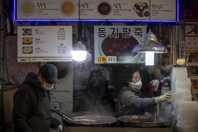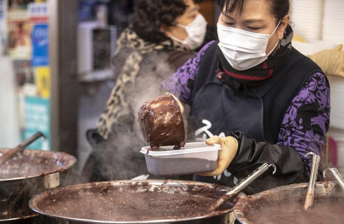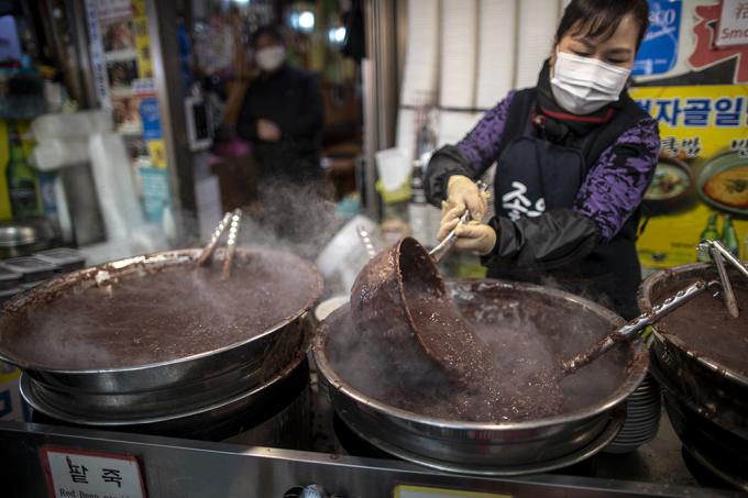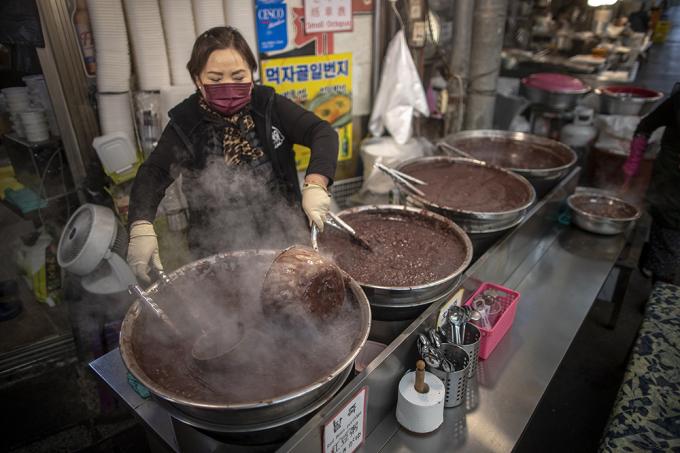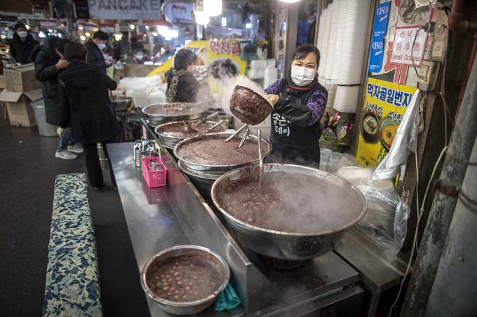 동지인 21일 오전 서울 종로구 광장시장 팥죽집이 분주하다. 선조들은 24절기 중 밤이 가장 긴 동지에 팥죽을 쑤어 먹었다. 팥의 붉은색이 액운을 물리친다면서.
