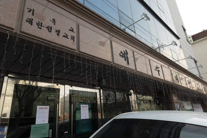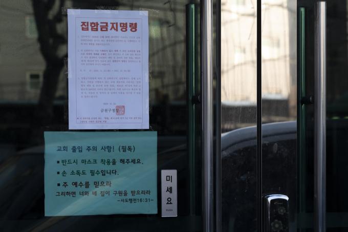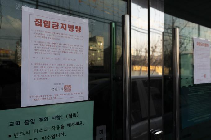 코로나19 3차 대유행이 지속되고 있는 22일 오후 집단감염이 발생한 서울 금천구 예수비전교회 입구에 집합금지명령문이 붙어 있다. 이 교회는 최초 확진자를 포함해 122명의 교인이 지난 13일 함께 모여 대면예배를 진행한 것으로 확인됐다. 예수비전교회는 지난 6월에도 교인 7명이 확진된 바 있다.