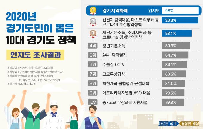 인지도 부분 상위 10개 항목은 △경기지역화폐(98%) △신천지 강력대응, 마스크 의무화 등 코로나19 보건방역정책(93.8%) △재난기본소득·소비지원금 등 코로나19 경제방역정책(93.1%) △청년기본소득(89.9%) △24시 닥터헬기(84.7%) △수술실 CCTV(84.1%) △고교무상급식(83.6%) △하천계곡 불법행위 근절대책(81%) △아프리카돼지열병 대응(79.5%) △중·고교 신입생 무상교복 지원사업(79.3%) 등이 꼽혔다.