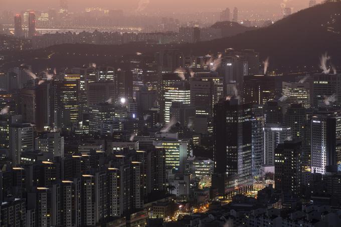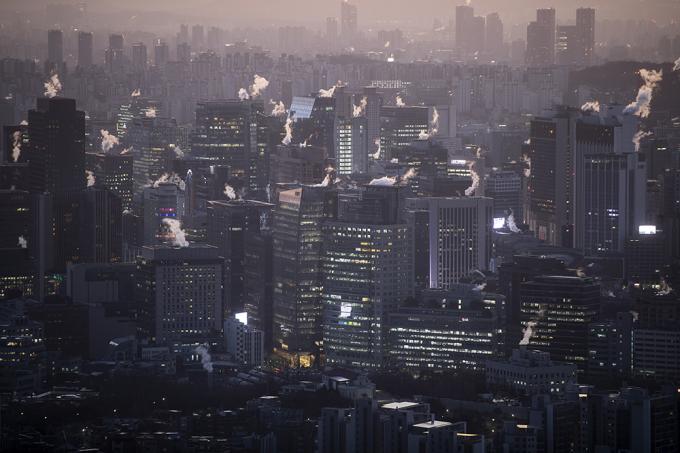 한파가 이어지고 있는 31일 오전 서울 서대문구 안산에서 바라본 서울 시내 빌딩에서 난방으로 인한 수증기가 나오고 있다.
