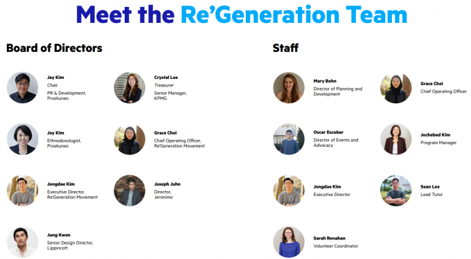 "'regeneration'은 '회복'이라는 뜻도 있는데, 중간에 세대를 뜻하는 'generation'도 들어가 있어서, 디아스포라 정체성을 갖고 사는 청소년과 청년세대를 통해 회복되는 세상이라는 의미를 담고 있다. Re'Generation Movement는 '평화를 만들어가는 글로벌 디아스포라 양성(empowering peacemaking global diaspora)'이란 미션을 가지고 활동하며, 디아스포라의 정체성으로 살아가는 청소년의 가능성에 투자하는 단체다. 특히 미국의 난민∙이민자라는 정체성을 품고 살아가는 청소년∙청년들에게 '다원화'라는 요소가 분열이 아닌 평화의 씨앗, 차별이 아닌 통합의 씨앗이 될 수 있도록 그들의 리더십과 가능성에 투자하는 단체이다."