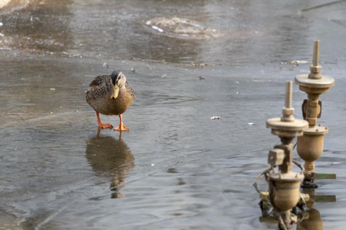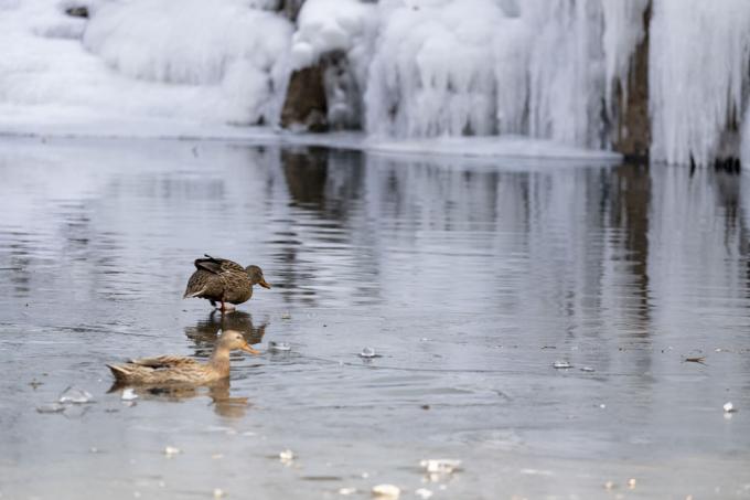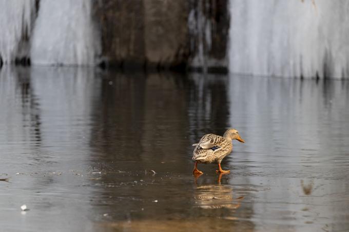 절기상 1년 중 가장 춥다는 소한(小寒)인 5일 오전 서울 서대문구 홍제천 일부분이 얼어붙었다. 오리가 어리둥절한 듯 주변을 살피며 걷고 있다.