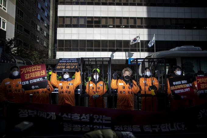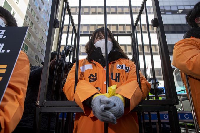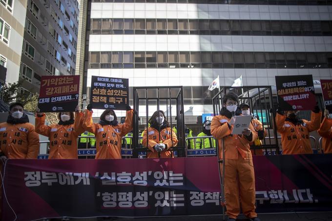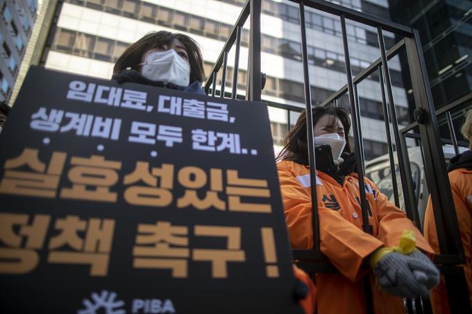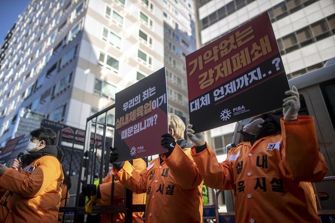 필라테스·피트니스사업자연맹 관계자들이 5일 오후 서울 영등포구 더불어민주당사 앞에서 정부와 국회에 고위험시설 지정 철회, 영업금지 조치 근거 제시 등을 요구하며 실내체육시설 종사자들의 생존권 보장 촉구 집회를 하고 있다.