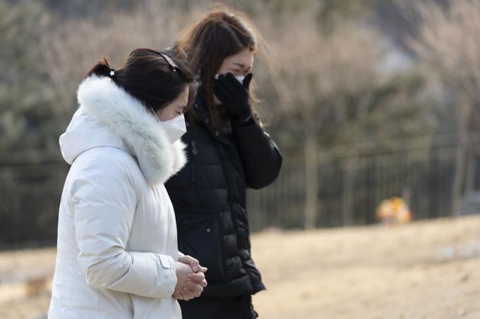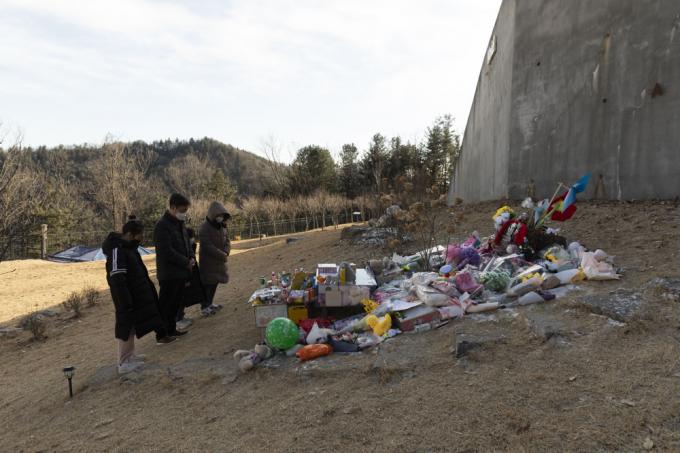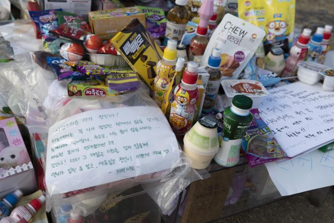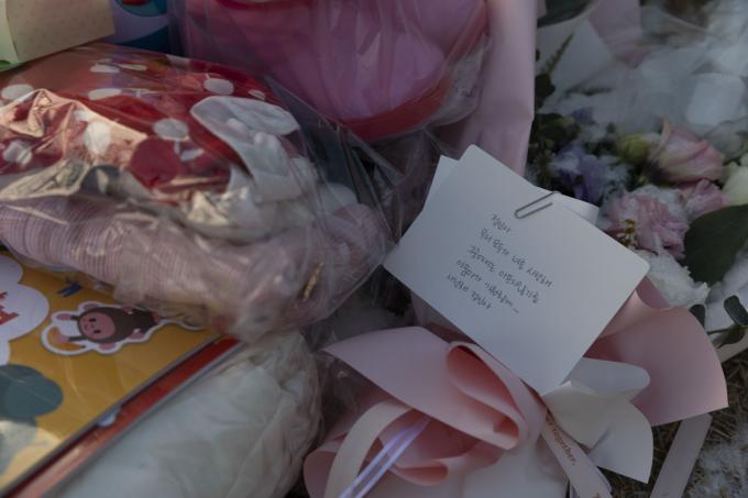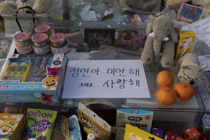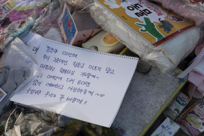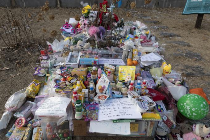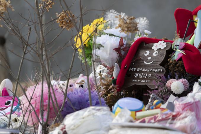 5일 오후 경기 양평 안데르센 공원묘원에서 한 가족이 양부모의 학대로 생후 16개월 만에 사망한 정인 양을 추모하고 있다.