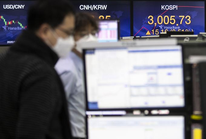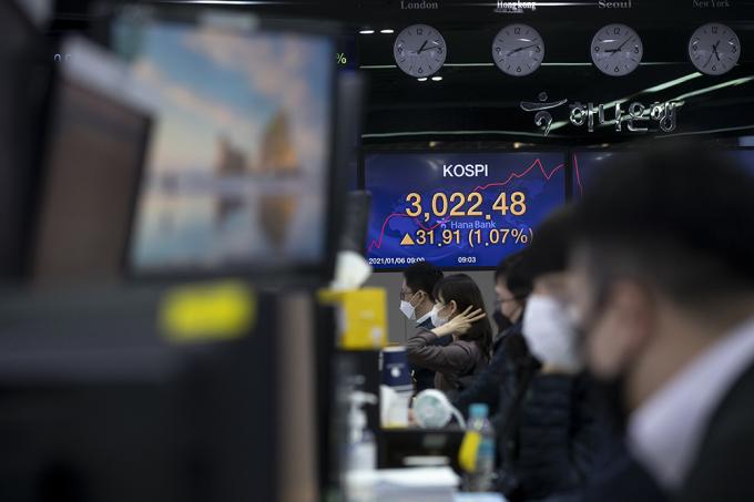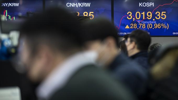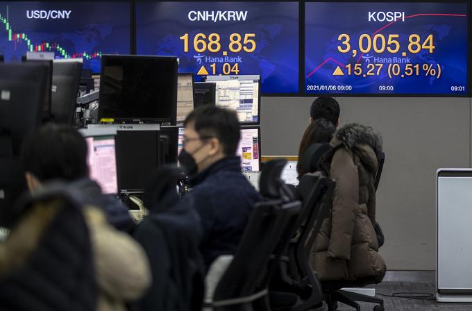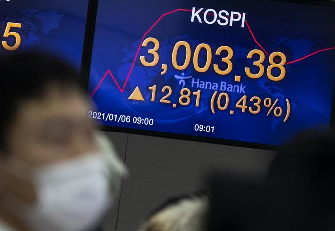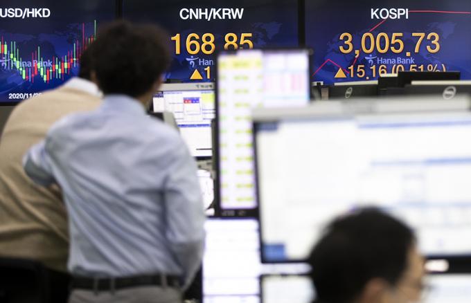 코스피가 사상 처음으로 3000선을 넘어선 6일 오전 서울 중구 하나은행 딜링룸 전광판에 코스피 지수가 나타나고 있다. 이날 코스피 지수는 2.77포인트 오른 2993.34에 장을 개장해 장중 사상 첫 3000선을 돌파했다. 코스피가 3000선을 넘긴 것은 2007년 7월 2000선을 첫 돌파한 이후 약 13년 5개월 만이다.