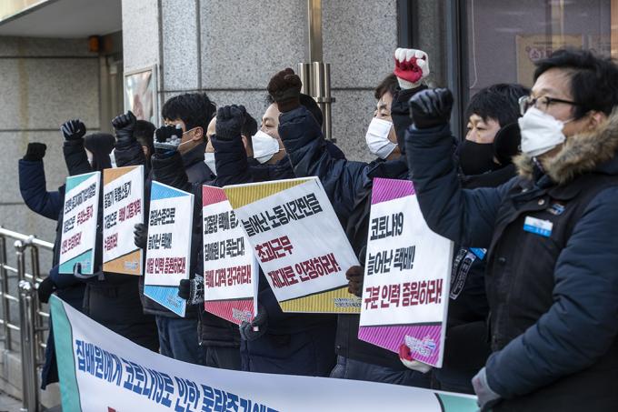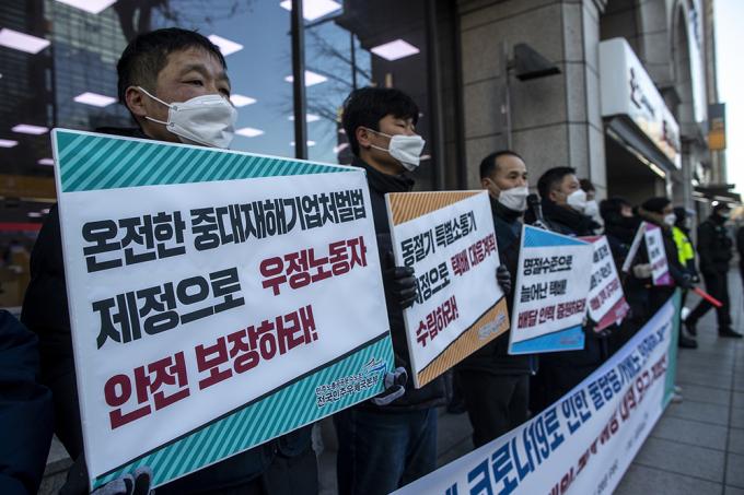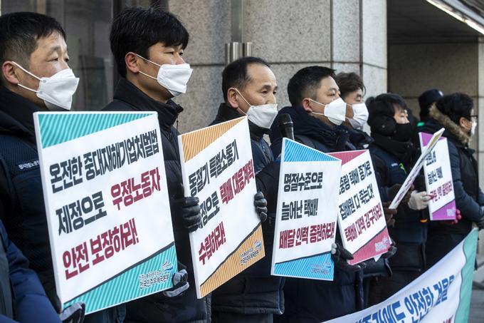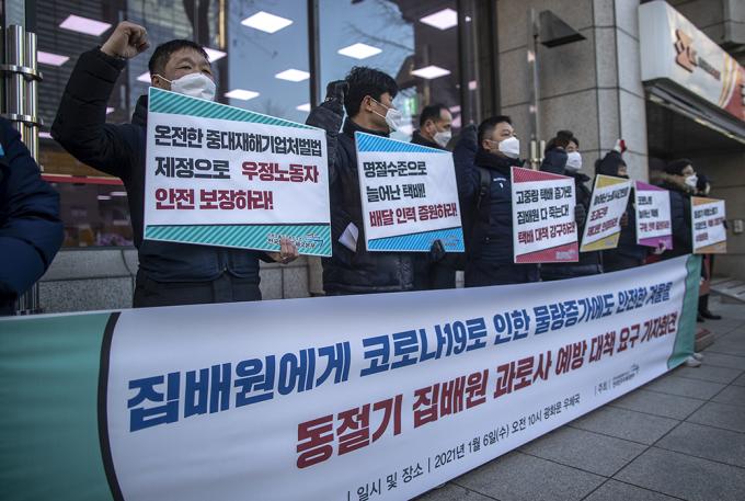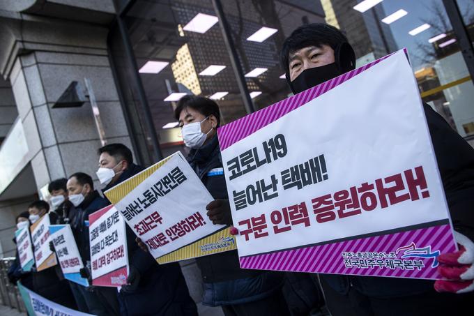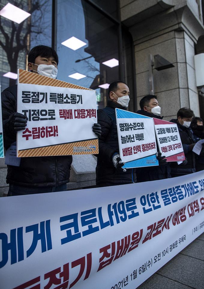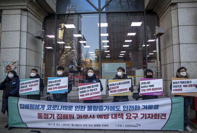전국민주우체국본부 조합원 및 집배원들이 6일 오전 서울 종로구 광화문우체국 앞에서 동절기 집배원 과로사 예방 대책 요구 기자회견을 열고 피켓을 들고 있다. 이날 기자회견에서 집배원들은 "2020년 하반기 이후 코로나19 여파 등으로 집배원 택배 배달 물량이 꾸준히 늘어나고 이륜차로 배달하기 어려운 고중량, 고부피 택배가 증가하고 있다"며 "다가올 설날이 오기 전에 선제적 대책과 동절기 특별소통기 지정을 통한 택배 대응계획 수립, 배달인력 및 구분인력을 증원해야 한다"고 말했다.